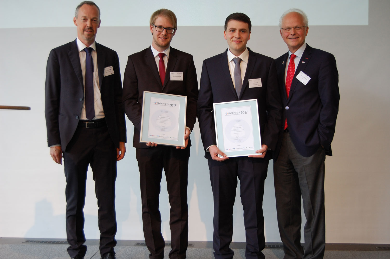 In diesem Jahr hat sich die Jury einstimmig dazu entschieden, die Auszeichnung an zwei Preisträger zu verleihen. Herr Christoph Rohr und Herr Lars Christopher Schmid erhalten den Förderpreis beide aufgrund ihrer hervorragenden Bachelor- bzw. Masterarbeiten und ihrer überdurchschnittlich guten Studienleistungen. Beide Preistrager erhalten neben der Auszeichnung jeweils ein Preisgeld in Höhe von 2.000 Euro.